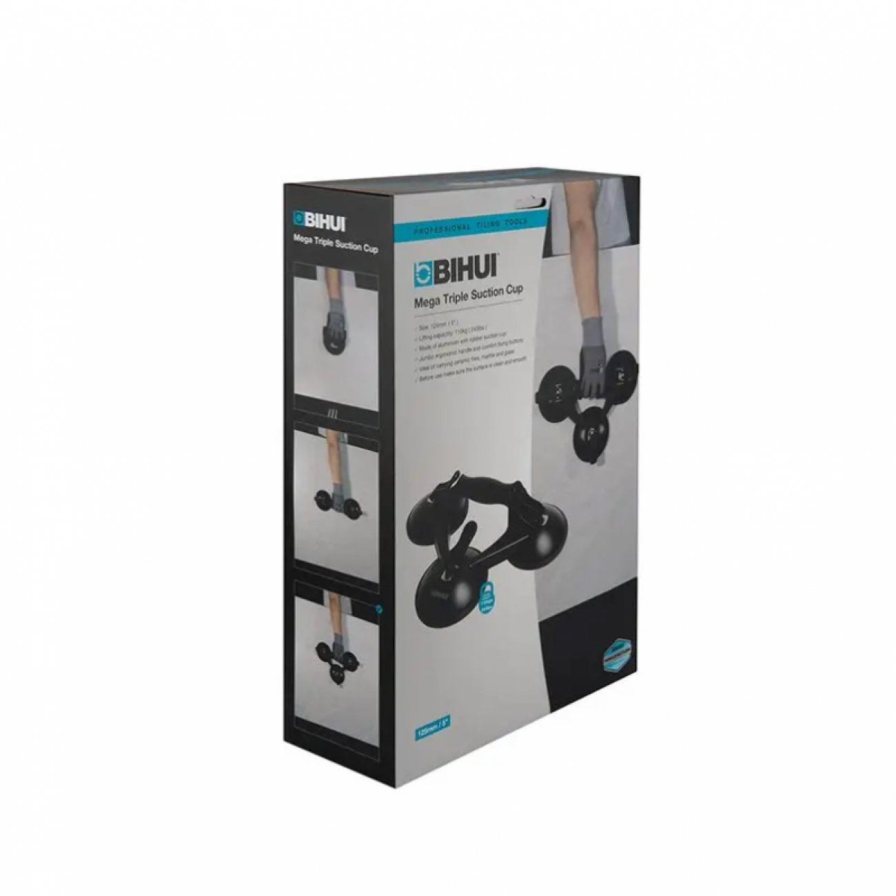 Profesionalni vakumski držač (trostruki) – BIHUI SCTB4 napravljen je od aluminijuma sa gumenim vakumom. Prečnika 5″ ima nosivost od 110 kg. Ergonomska ručica za veću udobnost u radu. Idealan je za nošenje keramičkih pločica, mermera i stakla.